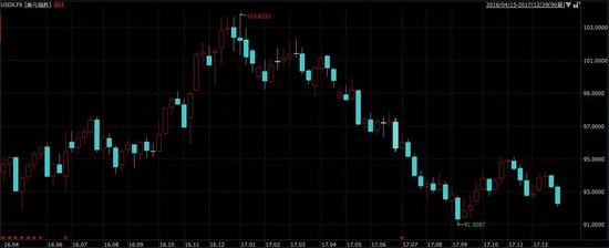 美元指数全年累跌接近10%,是2012年来首次年度下跌,且创十四年以来的最大年度跌幅。同时,美元在全球外汇储备中占比连续下降至63.5%,创2014年以来新低。尽管美国经济扩张,美联储收紧货币政策,且美国通过税改法案,美元2017年仍告挫跌。