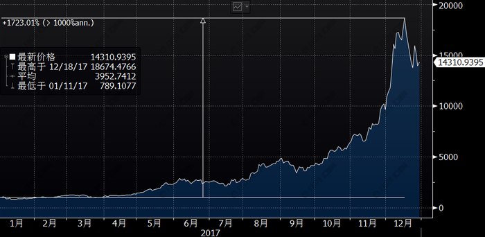 比特币全年最低价位是在1月11日的789美元,而全年最高价位、也是比特币纪录最高价是在12月18日达到的18674美元。