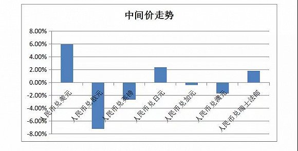 从上图可以看出,2017年人民币兑美元、日元、瑞士法郎中间价出现升值,兑欧元、英镑、加元、澳元中间价则出现贬值。从全年的波动幅度来看,兑欧元的贬值幅度最大(贬7.22%),兑美元的升值幅度最大(升5.98%),兑其他发达国家币种的波动幅度则相对较小。下面我们将从人民币兑主要国际化货币美元、欧元、英镑、日元的中间价走势进行具体分析。