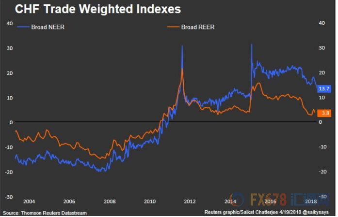 ① 瑞郎的贸易加权估值的下降也进一步预示了瑞郎贬值的可能,如下图: