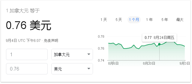 截止9月4日上午11点12分,加币兑美元汇率下跌0.7%至1.3182加币,或76美分。自7月24日以来,加币触及的最低点是1.3185元。加拿大主要出口产品之一的石油价格在两个墨西哥湾石油平台因飓风而撤离后大幅上涨。美国原油价格上涨1.8%至每桶71.04美元。