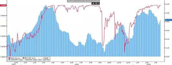 2019年3月,香港金融管理局已经进行了6次干预,是2015年10月以来干预次数最频繁的一个月,已买入172亿港币(22亿美元)来捍卫港币汇率不跌破7.8500。