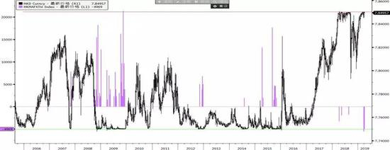 注:黑色曲线为美元/港币汇率,紫色柱状曲线为香港金管局干预的金额,负数代表买入港币。