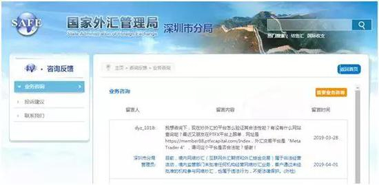 今年3月底,曾有网友在国家外汇局官网深圳分局咨询:我想咨询下,现在炒外汇的平台怎么验证其合法性呢?有没有什么网站查询呢?最近有朋友在PTFX平台上跟单,网址是https://member88.ptfxcapital.com/Index,外汇交易平台是“Meta Trader 4”,请问这个平台是否合法呢?