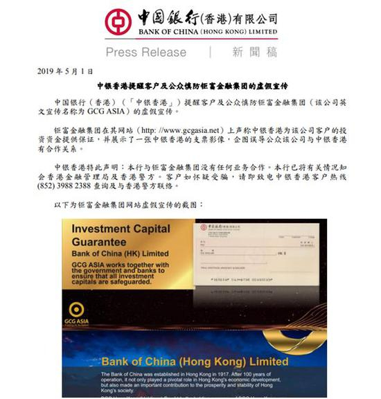 “GCG ASIA鉅富金融”的骗局可谓是漏洞百出,还虚构与中国银行(香港)有限公司合作,共同保障投资者的资金安全。5月1日,中银香港发布声明“提醒客户及公众慎防鉅富金融集团的虚假宣传。”