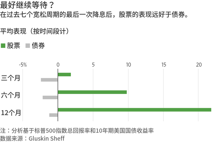 另外还有美联储降息前后的投资时机问题。多伦多资产管理公司Gluskin Sheff & Associates对此前类似周期(即美联储在加息之后转而降息)做了分析,发现标普500指数在每个周期最后一次降息后的一年内平均回报率为22%。