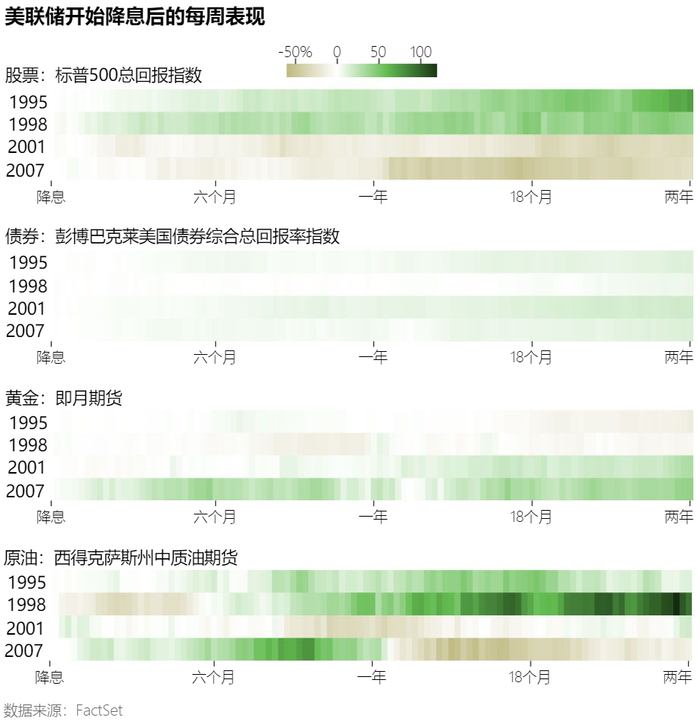 但这并非板上钉钉。历史证明,股市在美联储1995年和1998年从加息转向降息后上涨,但在2001年和2007年出现类似转变时,股市却连续多年下跌。油价也是如此,许多投资者认为,如果经济前景好转,油价应该会上涨。然而,在过去的降息之后,油价在两个方向都出现了波动。