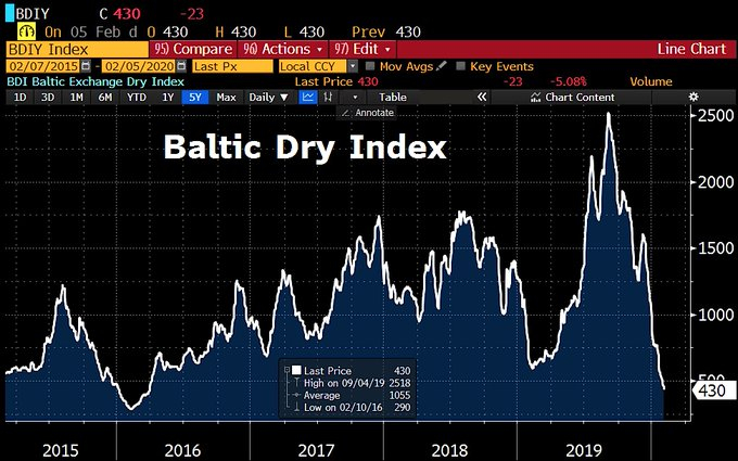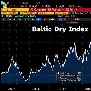 2019年12月初以来,有着全球航运晴雨表之称的波罗的海干散货指数(BDI)大幅下行。截至2020年2月5日,BDI指数报430点,自1月17日以来出现“十四连跌”,同时创下2016年4月5日以来的新低。