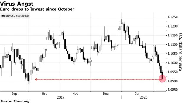 行情数据显示,欧元兑美元周一触及四个月低位,因对新冠状病毒疫情的担忧提振对避险资产的需求,而美国经济前景乐观和欧元区疲弱的经济数据令美元较欧元更具吸引力。