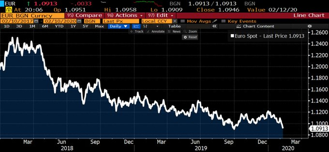 投资者担心,随着冠状病毒继续迅速传播,欧元区经济将进一步疲软。由于担忧,一些投行已经下调了对欧元汇率的预期值。摩根大通和加拿大皇家银行资本市场就下调了对该货币的预测。