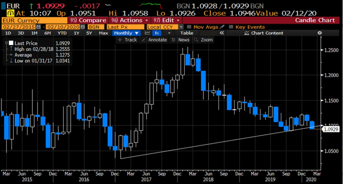 事实上,不仅是基本面利空不断,技术面上欧元似乎也已危在旦夕。如下图所示,在彻底宣告失守1.1000整数大关后,欧元兑美元目前已跌破了去年9月以来的上升趋势线。而在更长期的图形上,也已跌破了2017年年初以来的上升趋势线!