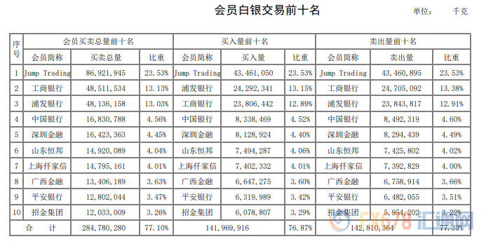 白银交易方面,量化交易机构Jump trading仍以绝对的优势位居榜首。工商银行和浦发银行在白银交易方面不相伯仲的趋势延续,两大机构交易量均在13%附近。