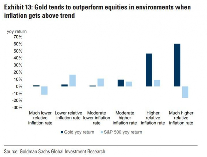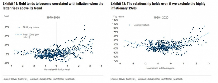 但是,如果加息幅度超过通胀水平(类似于沃尔克1980年的政策),将消除通胀的尾部风险,从而降低黄金的吸引力。此外,高盛发现,在高通胀时期,黄金是任何投资组合的有用补充。具体来说,该行研究了黄金和股票在之前通胀环境下的表现,通过观察年通胀率与10年滚动平均通胀率的偏差来划分通胀机制。