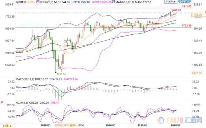 上行方面,强阻力位仍旧关注1789.28,这是自2012年10月以来的高点。若突破,上看1800.00关口,这既是重要的心理关口,也与布林带上轨相近;进一步走高的话,将大幅打开上行空间。