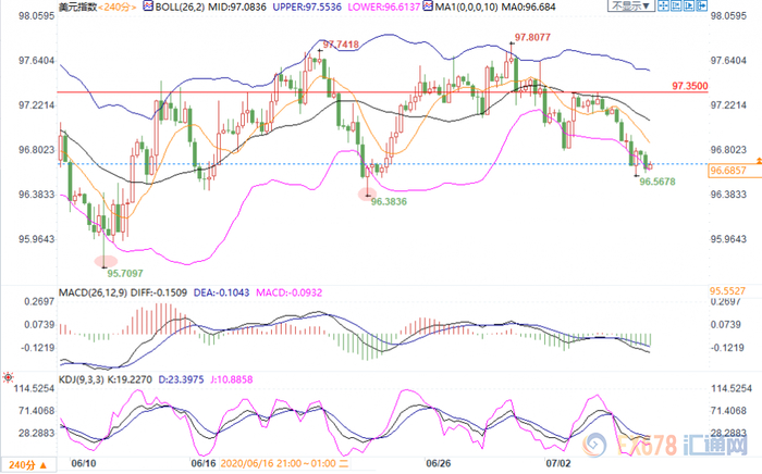 下方支撑位先留意布林带下轨96.26,强支撑关注6月10日触及的3个月低点95.70。进一步走低的话,甚至可能回踩前低94.63。此外,95.00关口也有一定支撑性。