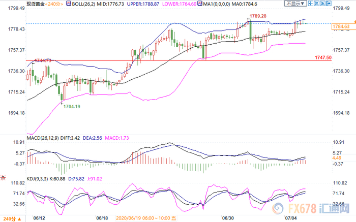 4小时级别:高位震荡;四小时级别来看,金价承压布林带上轨下方,窄幅震荡;MACD金叉,KDJ金叉、指数高于70。从技术面来看,黄金短线偏震荡走高。上行方面,强阻力位上看前高1789.28,这也与布林带上轨接近重合。一旦上破,阻力位看向进一步留意1800.00关口。