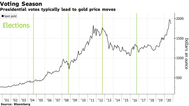 过去20年,黄金在美国大选前后往往会波涛汹涌,因为投资者要权衡大选对美元、美国国债收益率和全球政治风险的潜在影响。今年11月的美国大选可能是几十年来最令人担忧的一次,投资者可留意黄金是否能从相关不确定性中受益。