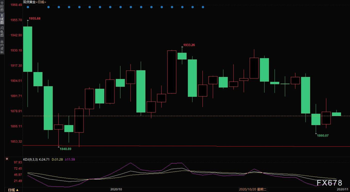 周一(11月2日)现货黄金小幅下跌,跌幅0.2%;上周五黄金止跌反弹,涨幅0.61%,因美元涨势暂停,对新冠疫情新增病例数上升的担忧以及围绕下周美国总统大选的不确定性为避险黄金提供了支撑。