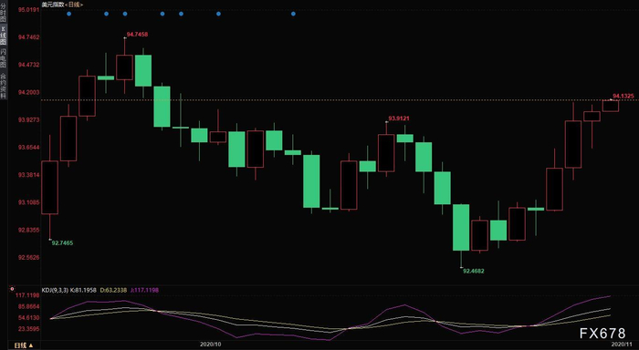 周一开盘,美元指数小幅上升0.1%,站上94关口;此前一度下跌0.3%;上周该指数上涨1.4%,创下一个多月来的最佳单周表现。尽管美国大选形势不确定性加剧,但就业数据揭示经济面临挑战、财政刺激政策难产以及美欧疫情凶猛反扑,提振了美元的避险属性,令美元计价的现货金价仍承受压力。