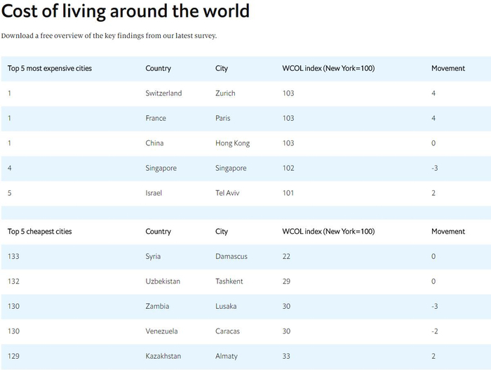 最新全球城市生活成本排行榜:香港、巴黎、苏黎世并列第一