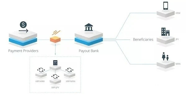 Ripple有三种跨境支付解决方案,其中一种是用瑞波币XRP来作为中间媒介进行结算。模式为支付方先将支付金额换成瑞波币,发送给收款方的银行,银行将收到的瑞波币转换成对应的货币,再支付给对应的收款方。这种模式只需要收款方的银行可以接受瑞波币并换成对应法币即可。当然将瑞波币转换为当地货币的步骤也可以由收款人自主完成。