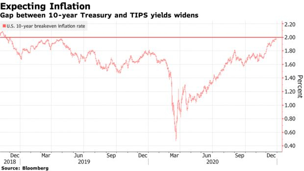 在2020年仅剩下最后几天的时刻,一项通胀指标在隔夜引起了业内人士的注意:债券投资者两年来第一次押注美国未来十年的通货膨胀率年均将接近2%。