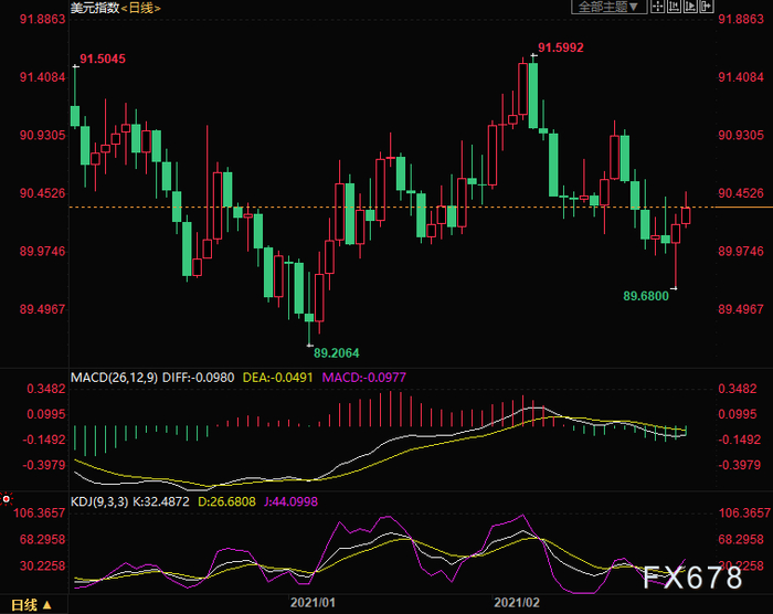 周五(2月26日)亚洲时段,美元指数周五摆脱了七周低点,反弹0.16%至90.34,此前10年期美国公债收益率跳升至1.6%,因美国公债标售需求低于预期。非美货币集体下跌。