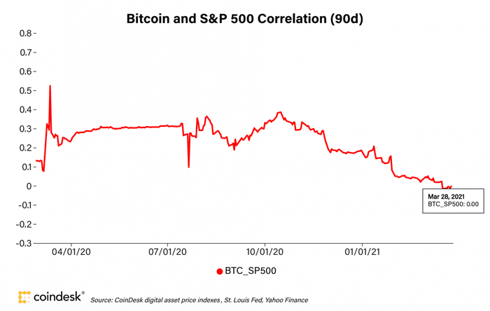 这也导致比特币与美国标普500指数之间的90天关联度已降至零。在去年大部分时间,比特币与标普500指数之间的关联度略有同步,让比特币的反对者质疑比特币的分散投资功能。