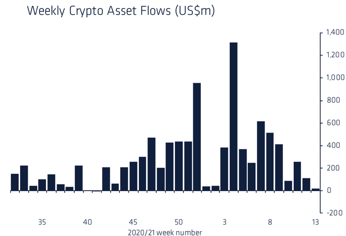 但数字资产投资公司CoinShares的一份新报告显示,在截至3月26日的7天期间,流入数字资产投资产品的资金减少了约7900万美元至2100万美元,为去年10月以来的最低水平。投资者对加密货币基金的兴趣放缓,反映了比特币在过去一周的横盘走势。CoinShares在报告中写道:“最近几周,投资者对数字资产的兴趣减弱,因为波动性仍然很高,价格横盘交易。”该报告称:“我们最近目睹了规模更大、成立时间更长的在2016年之前成立的投资产品的资金流入大幅减少,在某些情况下出现了流出。”“我们认为,这是由于投资者坐拥多年获利了结。”美国的投资流正在放缓,而欧洲和加拿大的投资流继续保持坚挺。数字资产投资产品的交易量上周降至7.88亿美元/天,而2021年迄今为止的日均交易量为9亿美元。其中比特币的资金流入最多,“但以太坊在市值基础上(正如我们在前几周所看到的)仍然更受欢迎,有500万美元的资金流入。”