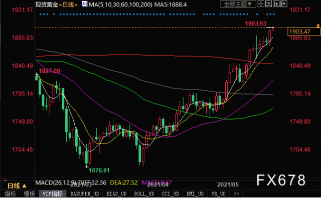 周二亚洲早盘,现货黄金再次冲破隔夜创下的1900.29美元高点,涨至1903.93美元/盎司