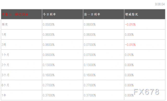 08月25日香港银行间同业拆借利率港币:隔夜报0.05% 1周期报0.06% 1月期报0.08% 3月期报0.16% 6月期报0.27%