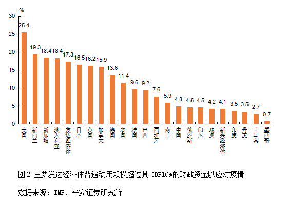 财政政策方面,根据IMF统计,截至2021年7月,主要发达经济体已经动用了规模达其全年国内生产总值(GDP)的17.3%的财政资金(包括额外财政支出及放弃的财政收入)以应对新冠肺炎疫情(见图2)。其中,美国动用的财政刺激金额超过GDP的25%。2021年,美国拜登政府推出1.9万亿美元“美国救援计划”,其中有近1万亿美元用于补贴居民,使美国居民整体收入超过新冠肺炎疫情前水平,造就了终端消费的强劲。此外,美国还推出初始价值高达4万亿美元的中长期财政计划,虽然法案尚未实施,但在预期层面提升了消费和投资需求。值得一提的是,在事实上践行现代货币理论(MMT)之下,发达经济体实现了货币政策与财政政策的配合,财政融资成本的下降以及财政纪律的弱化,化作一剂“兴奋剂”,更加明显地刺激着需求的增长。