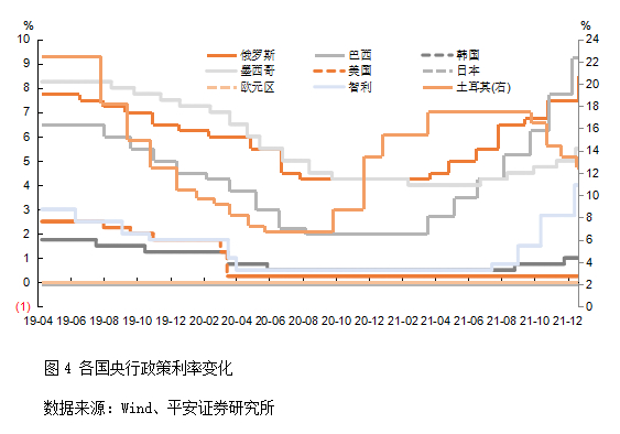 第二,全球货币与财政刺激转向或退坡,政策余量空间有限。货币政策方面,随着经济复苏更加充分、通胀压力持续攀升,2022年全球大部分央行均可能迈向紧缩,全球流动性收紧是必然趋势。美联储已经于2021年12月宣布加快削减资产购买,预计将于2022年3月结束QE,最新点阵图预测2022年或加息3次。其他发达经济体央行方面,英国央行在2021年12月已经首次加息,加拿大央行已于2021年10月结束QE,而澳洲央行的“鸽派”引导在市场失效。上述市场的短端国债利率自2020年10月以来已经陡然上行,金融环境已开始趋紧。新兴市场方面,有相当一部分央行已经于2021年“抢跑”加息,如俄罗斯、巴西、土耳其、墨西哥、智利等。
