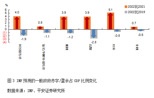 财政政策方面,2022年大部分经济体或开始缩减赤字,试图向“稳健财政”的基调回摆。根据IMF最新预测,2022年发达经济体一般政府赤字率将大幅缩窄4个百分点左右,新兴与发展中经济体将缩窄0.8个百分点(见图3)。虽然前期财政对居民的补贴可能仍有余量,但以美国为例,随着居民可支配收入不断消耗,截至2021年四季度,美国居民储蓄率已经基本降至新冠肺炎疫情前水平。因此,2022年财政刺激余量对居民收入和消费能力的提升料将有限。