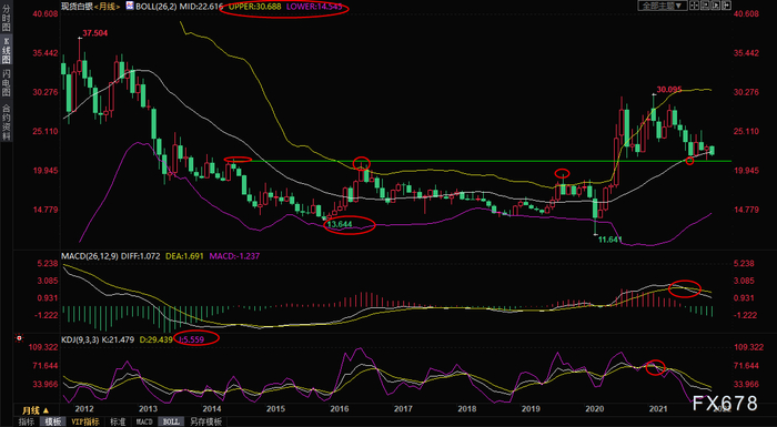 从周线图来看,银价在布林线中轨下方运行,MACD粘合,KDJ轻微向下发散,后市略微偏向下行,关注10月份低点21.42附近支撑,也是布林线下轨支撑所在,如果跌破该支撑,或将打开下跌通道。