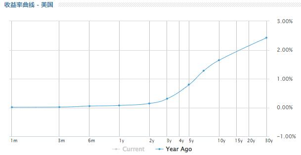 在正常情况下,美债收益率曲线理应是一条从左至右(从短期到长期)向上倾斜的曲线,如下面这张我们所截的一年前的美债收益率曲线图: