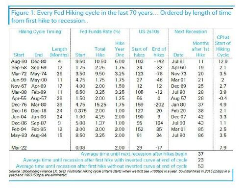 类似的统计在德意志银行分析师Jim Reid近来的研究中也同样被提及。Reid发现,虽然并非每个美联储加息周期都会导致衰退,但所有使得收益率曲线倒挂的加息都将在1到3年内触发经济衰退。