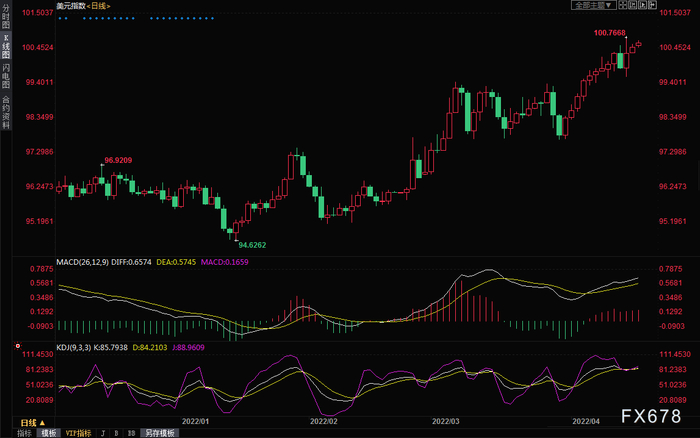 由于经济数据相对乐观,进一步强化美联储大幅度加息预期,美元指数表现强劲,目前交投于100.60附近,距离上周创下的近两年高点100.76相去不远。这令黄金短线涨势也受到了一些限制。