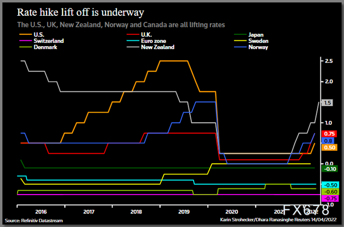 各国央行正加紧遏制飙升的通胀,新西兰和加拿大上周积极加息50个基点,欧洲央行上周四坚持今年缩减刺激措施的计划。