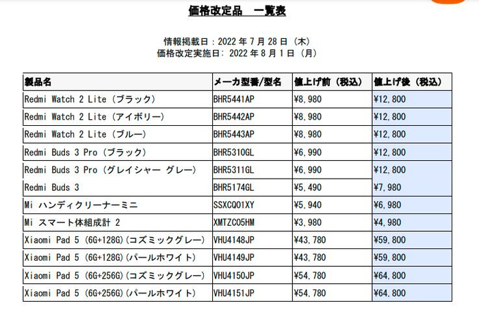小米日本商城表示,“我们正在尽最大努力以合理的价格提供我们的产品,但由于供应链成本飙升和日元汇率的影响,很难维持目前的价格。因此,为了继续提供优质的产品和服务,我们将对价格进行如下调整。”