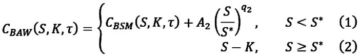 相较于我们已经比较熟悉的欧式期权(European Option),美式期权(American Option)的关键特征在于能在到期日或到期日之前任何一天或到期日前约定的时段提前行权。关于美式期权的定价模型,目前较为主流的方法是Barone-Adesi-Whaley二次近似法(以下简称BAW模型),该模型的核心思想是将美式期权拆解为欧式期权和提前行权溢价,同时将提前行权溢价本身也视作一种期权,进而可以用偏微分方程求解。BAW模型的优势在于可以利用Black-Scholes模型,在确定好提前行权边界