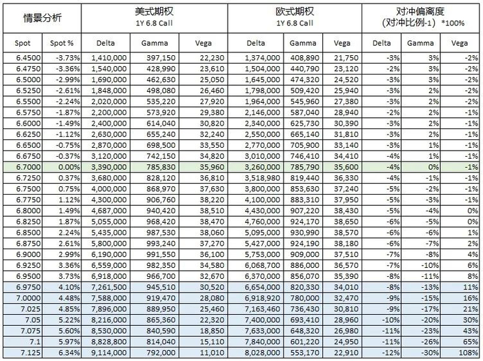 银行可以通过交易掉期对冲利率错配风险。如银行买入名义金额为10mio美元的1年期行权价为6.8的USDCNY美式看涨期权,卖出10mio美元相同要素的USDCNY欧式看涨期权进行对冲,对冲期初USDCNY即期汇率为6.7时DV01错配不明显。假如USDCNY即期汇率为6.9时,Rho错配金额达到了1.6万美元,可以S/B 1.6mio 1Y掉期;假如USDCNY即期汇率为7.0时,Rho错配金额达到了2.9万美元,可以S/B 3mio 1Y掉期。