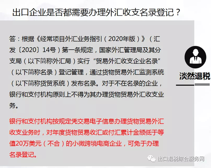 外汇管理局-办理外汇收支名录登记,外管局实行“贸易外汇收支企业名录”登记管理,统一向金融机构发布名录,金融机构不得为不在名录的企业直接办理贸易外汇收支业务。简单来说新出口公司不办理外汇收支名录登记无法正常收汇。