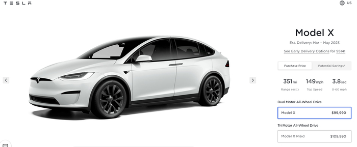 Model X基础款和高性能版的价格均被下调了1万美元。基础款价格下较之前的109990美元降了9%,至99990美元,而Plaid高性能版的价格较之前的119990美元降了8%,至109990美元。
