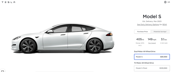 特斯拉网站显示,两款Model S的售价均被下调了5000美元。Model S基础款价格较之前的94990美元降了5%,至89990美元,而Plaid高性能版的价格较之前的114990美元降了4%,至109990美元。