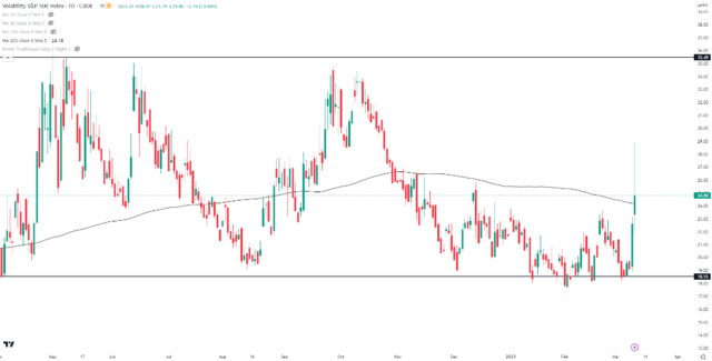 追踪美国银行业表现的基准指数KBW单周重挫15.8%,衡量地区性银行表现的KBWR下跌12.2%。恐慌指数VIX(下图)连续第二天大幅拉升并一度触及年5个月新高的29。