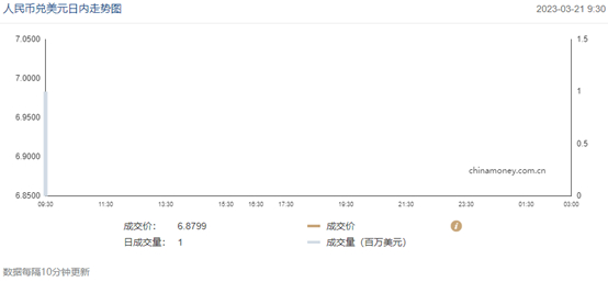 今日(3月21日),人民币兑美元中间价报6.8763,较前贬值69个基点。在岸市场人民币兑美元即期汇率开盘价报6.8799,其后人民币呈震荡走势。离岸市场人民币兑美元开盘价报6.8737。