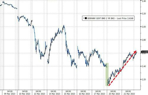 除了美债外,2年期德债收益率周二也飙升了26个基点,创下2008年以来的最大涨幅。2年期德债收益率目前较昨天低点已飙升了惊人的52个基点……