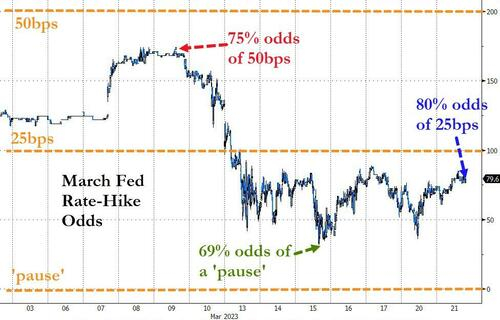 毫无疑问,自3月初以来,联邦基金期货市场对于美联储本月究竟会加息多少的预期,已经经历了多轮变动——加息预期最为高涨时,人们曾预计美联储至少有3/4的概率加息50个基点,而在银行业危机最为紧张的时刻,市场则曾更为相信美联储将在本月按兵不动,甚至一度出现过降息的预期。