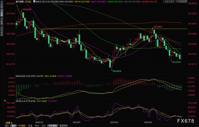 周五(3月31日)亚市盘初,美元指数窄幅震荡,目前交投于102.20附近。隔夜美元指数下跌0.47%,盘中最低触及102.09,逼近上周触及的近两个月低点101.91,收报102.17,为2月2日以来最低收盘价。德国通胀数据提振欧元,且对银行业的担忧有所缓解,美国数据不佳,都对美元产生拖累,进而给金价提供支撑。